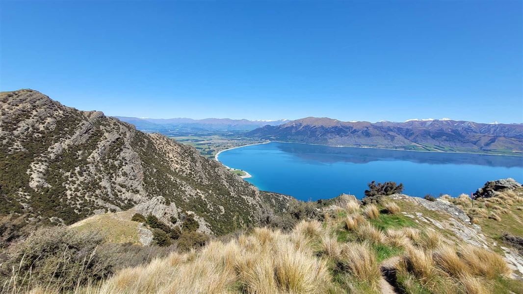 The track ascends to the high point at 1300 m, then follows a prominent ridge as it descends towards Lake Hāwea. It then zig-zags down, ending at Tīmaru Creek Road, on the edge of Lake Hāwea, around 1km from Johns Creek township or approximately 6 km from Lake Hāwea township.