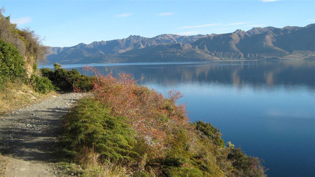 From the carpark follow the 4WD road, on foot or bicycle, above the lake to Rocky Point around the bluffs. On clear days Mount Aspiring/Tititea can be seen from here. After about an hour and a half the road reaches Silver Island Bay. Here the public track leaves the road and crosses the Silver Burn. It then climbs and sidles around the peninsula's western side for spectacular views into the Hunter valley.