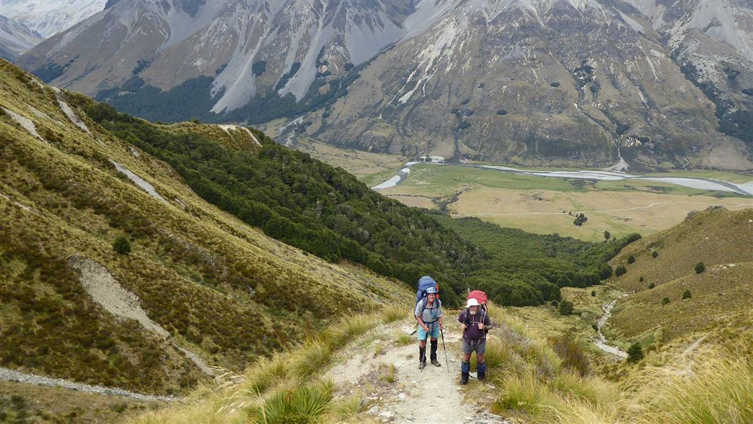 A well-formed track from Top Dingle Hut rises 600 m to the Dingle Burn Saddle (1448 m) ridge line, before descending into the Ahuriri Valley.