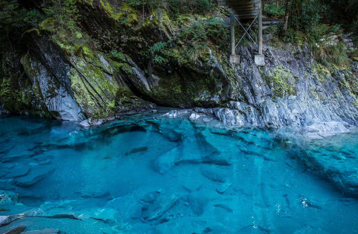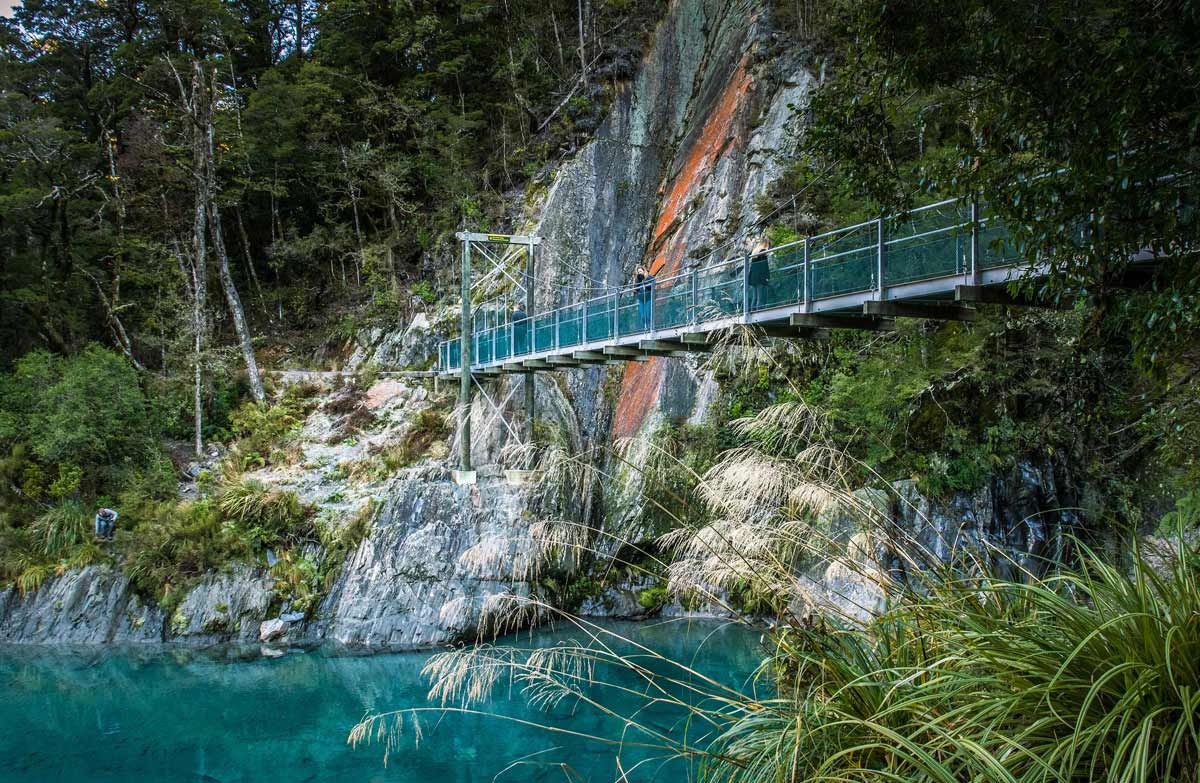 Continue on a boardwalk to the second swing bridge, which is the viewing platform over the Blue Pools. Cross this bridge for great views up the river gorge.