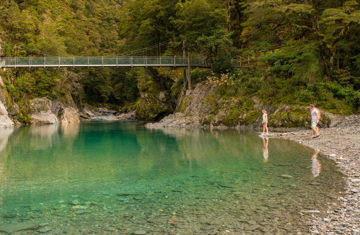 An easy short walk through mature beech and podocarp forest leads to these natural wonders of pure glacial water gathered from the mountains. Travel through open flats for spectacular mountain views and enjoy the coolness of the beech forest to a swing bridge over the Makarora River.