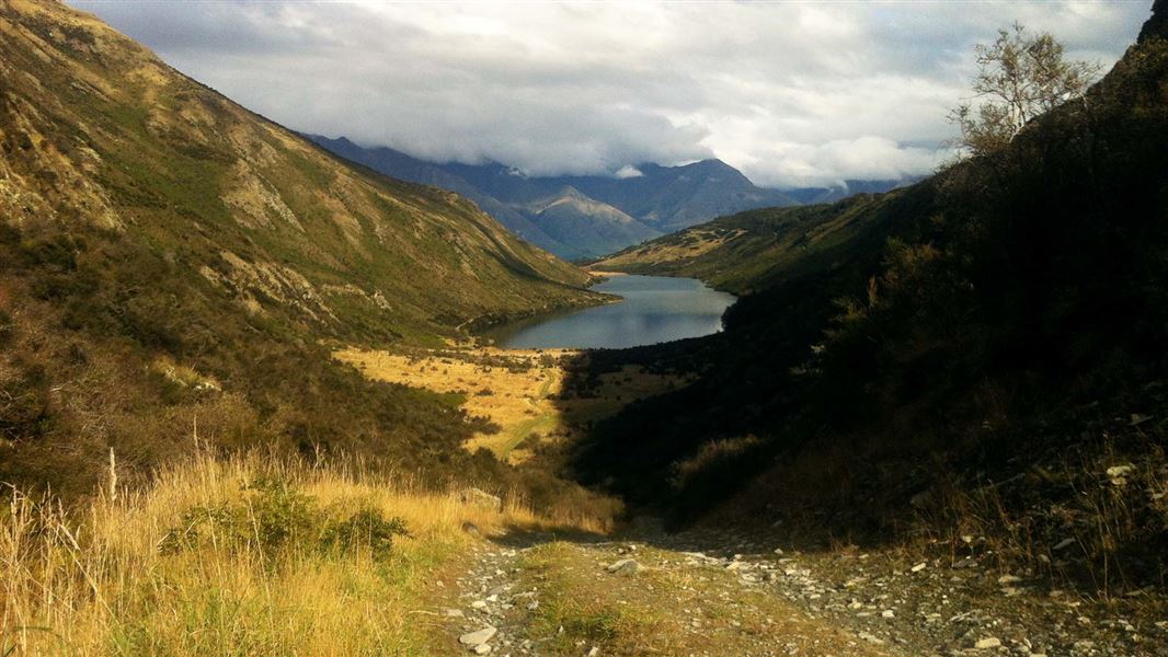 The track heads up through a short, steep saddle to skirt farmland and follows the fence line to reach the southern end of Moke Lake.