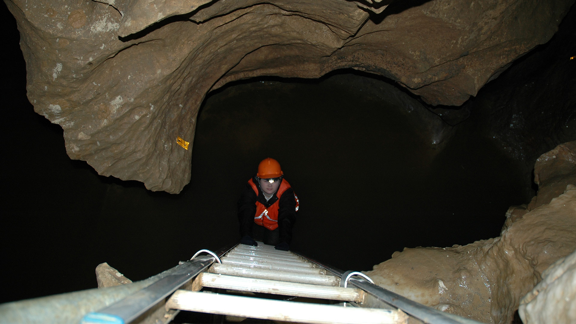 Following along from the pool, there is an intersection – stay left in order to exit the cave system safely (the right hand route should only be undertaken by experienced cavers who have ropes and climbing equipment). After the pool there are three 4 m-high ladders. These are only suitable for one person at a time.