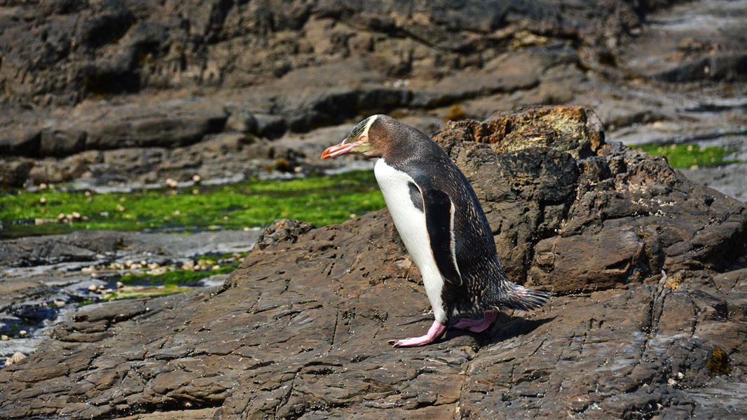 Several hoiho or yellow-eyed penguins nest in the area around Curio Bay/Waikawa. They are one of the rarest penguins in the world with an estimated total population in New Zealand of between 6000 and 7000. The population has declined because of the clearance of coastal forest in which the penguins nest. They are also affected by introduced predators such as stoats, ferrets and dogs, while stock may disturb their nests.
