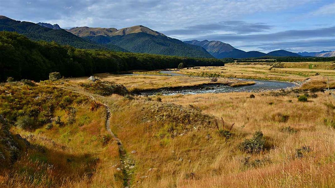 The track into the Whitestone River valley follows on up the Kiwi Burn from the hut to a low bush saddle then descends to the Whitestone River. It then follows the river downstream on the true left side. This is pleasant walking with good camping on the open river flats. Use of portable stoves is encouraged; a permit from DOC Te Anau is required to use an open fire.