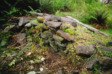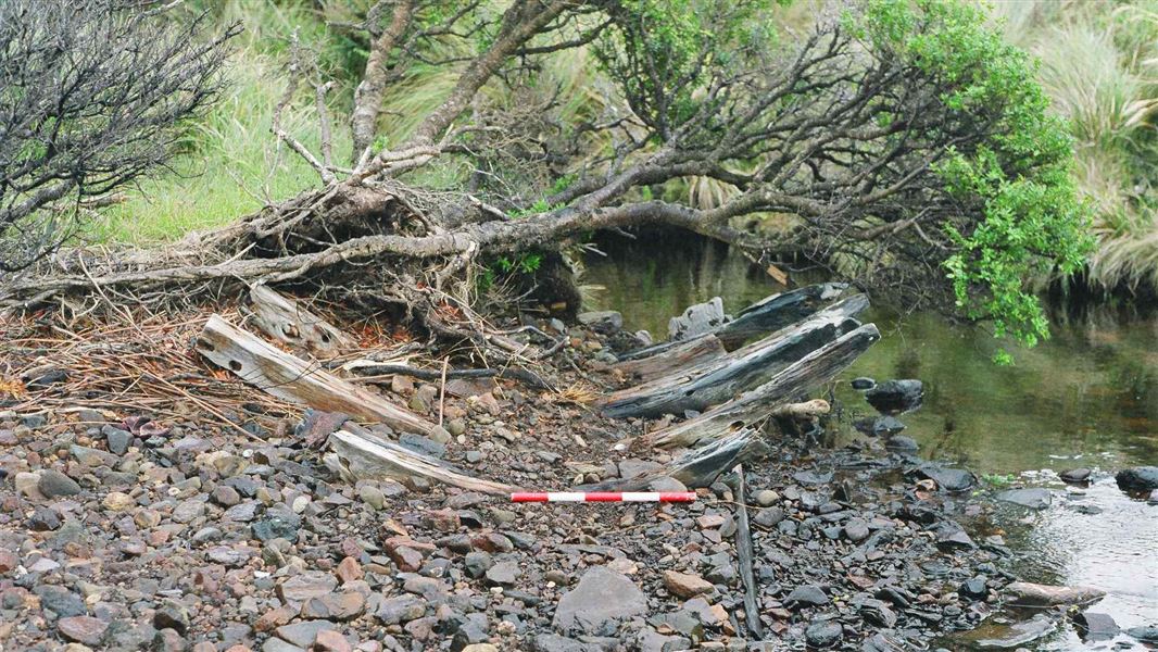 A few ribs of Auckland Island's earliest recorded shipwreck, the Grafton, lie in the beach gravel at the southern end of Carnley Harbour. The anchors rest on the seabed out from the shore. Nearby the remnant of a stone fireplace is all that is left of the Epigwaitt; a hut the castaways built using the ship's remains.