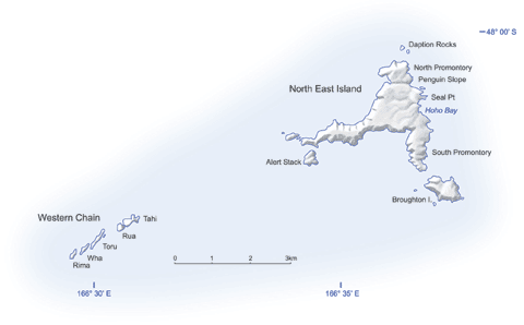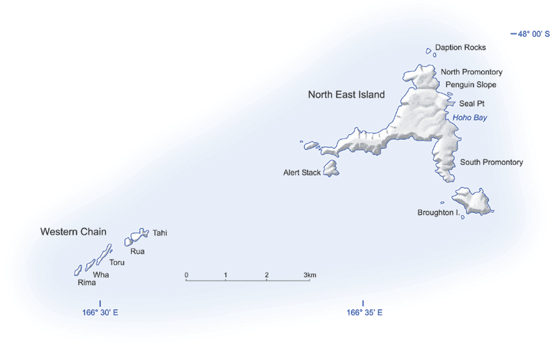 North East Island is the main island in The Snares group. It is surrounded by many smaller islands and rocks, the largest of which is Broughton Island in the north, and a group of six islands known as the Western Chain about 5km west-south-west.