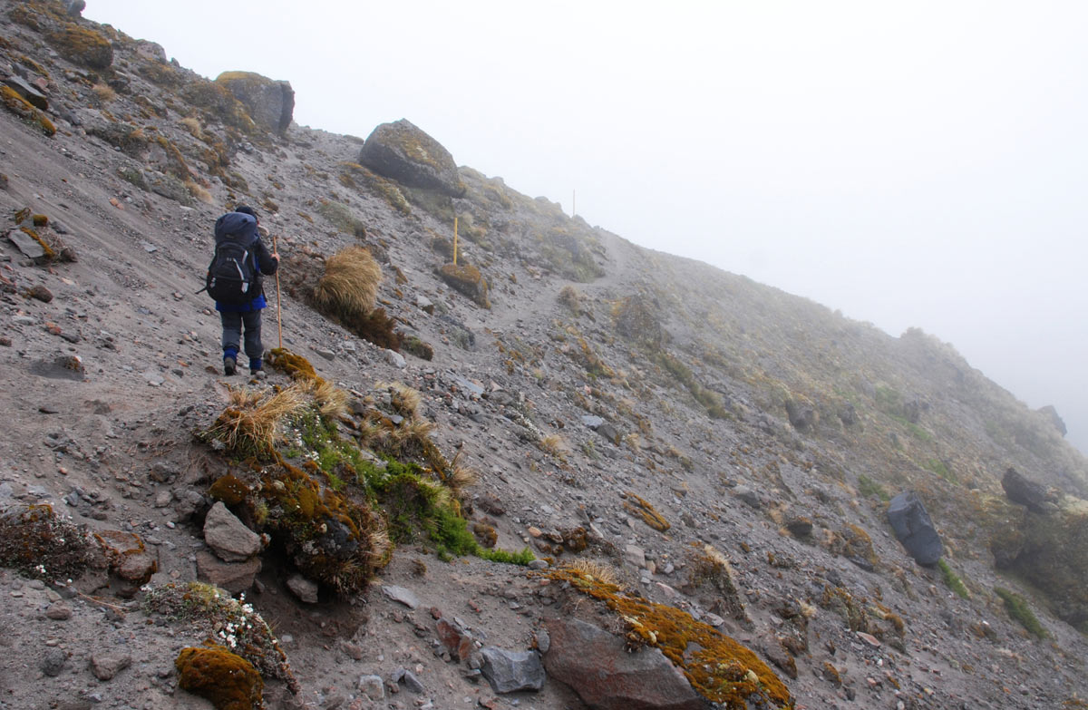 Ten minutes past the junction, you will come to a lookout. This is the start of the alpine section of the track, so look at the weather and make sure you have the gear for the conditions. If you aren’t well-equipped enough and/or if the weather is so bad that you cannot see the maunga, then we recommend returning down the Veronica Loop Track and trying the crossing another day.