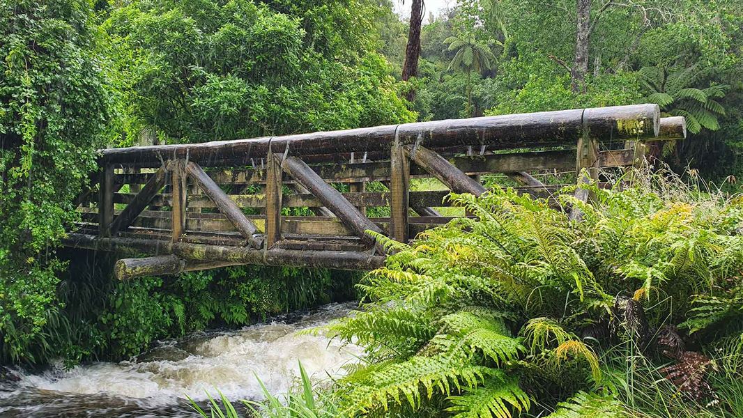 Cross the Waiwhakaiho River on the suspension bridge before entering a stand of regenerating lowland forest including matai, rimu and kahikatea.