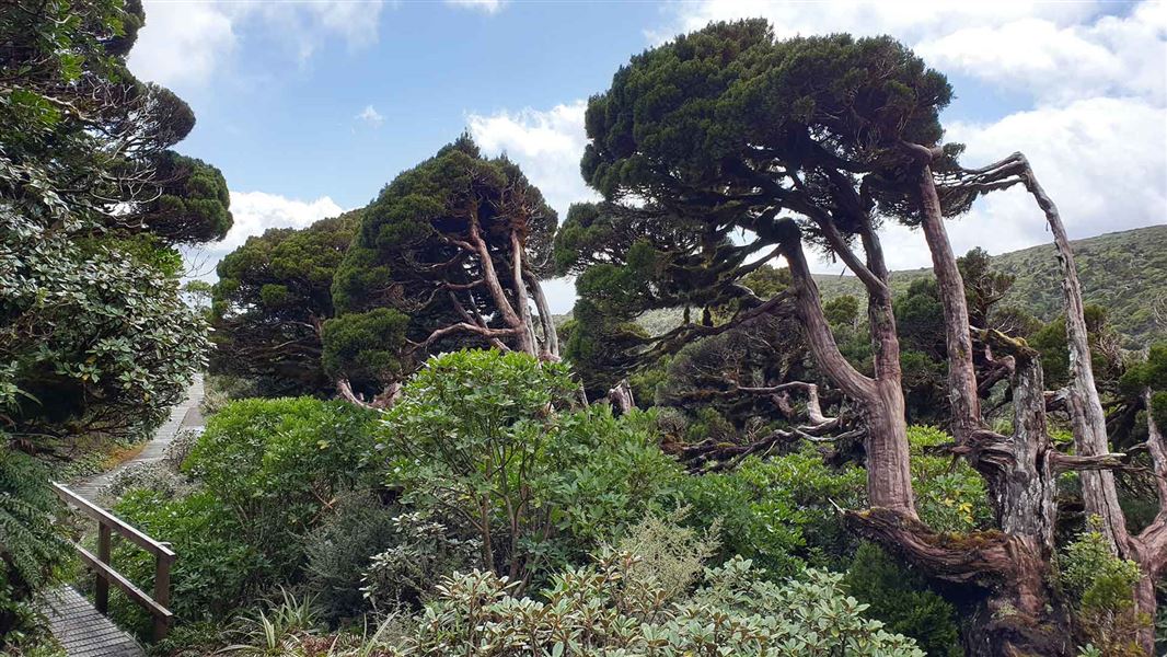The road climbs through popdocarp/broadleaf forest and then the montane forest, reaching the accommodation centre of the Ngāti Ruanui Stratford Mountain House. The road winds its way another 3 km to the road end car park at The Plateau (1172 m) where there are superb views of the surrounding countryside.