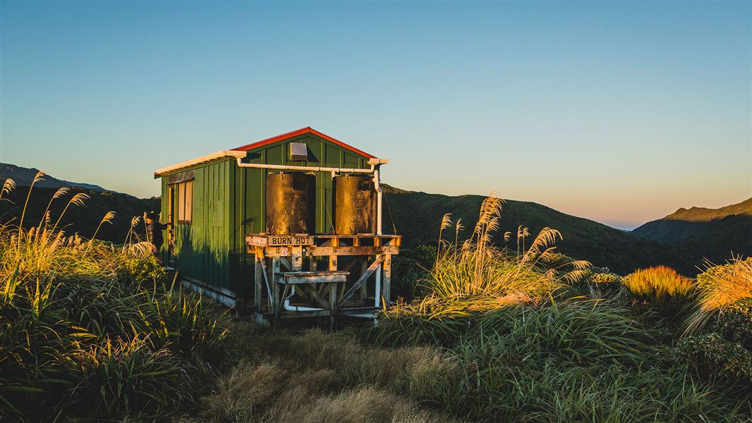 The track starts on the far side of the dam and sidles down the true right of the river for around 1 hour. Just past a wooden bridge the track starts to climb for about another hour to the bush line. Once onto the leather wood covered tops the track follows the ridge for another hour to Burn Hut which is located on a small spur.