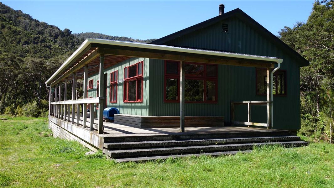 Totora Flats Hut sits on river flats above Waiohine River.
