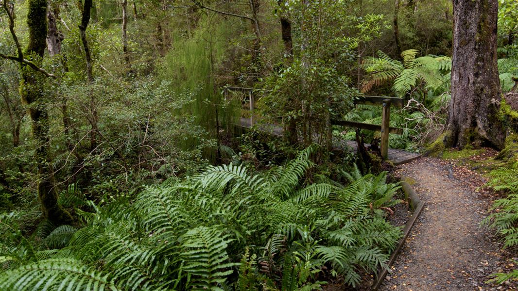 Twenty minutes later, after crossing the boardwalks through the heathland of Pig Flat, Mountain House Shelter is reached, nestled among silver beech.