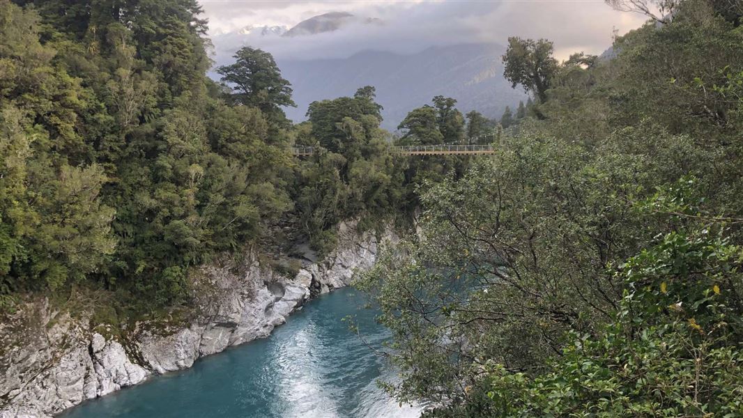 After 200 metres of wandering track, the 90-metre suspension bridge crosses the main channel of the Hokitika Gorge before entering the forest canopy of Miro, Rimu, and Kamahi as the bridge passes over an island and then a flood channel. The bridge offers spectacular views of the Hokitika Gorge, mature forested surrounds and the foothills of the Southern Alps.