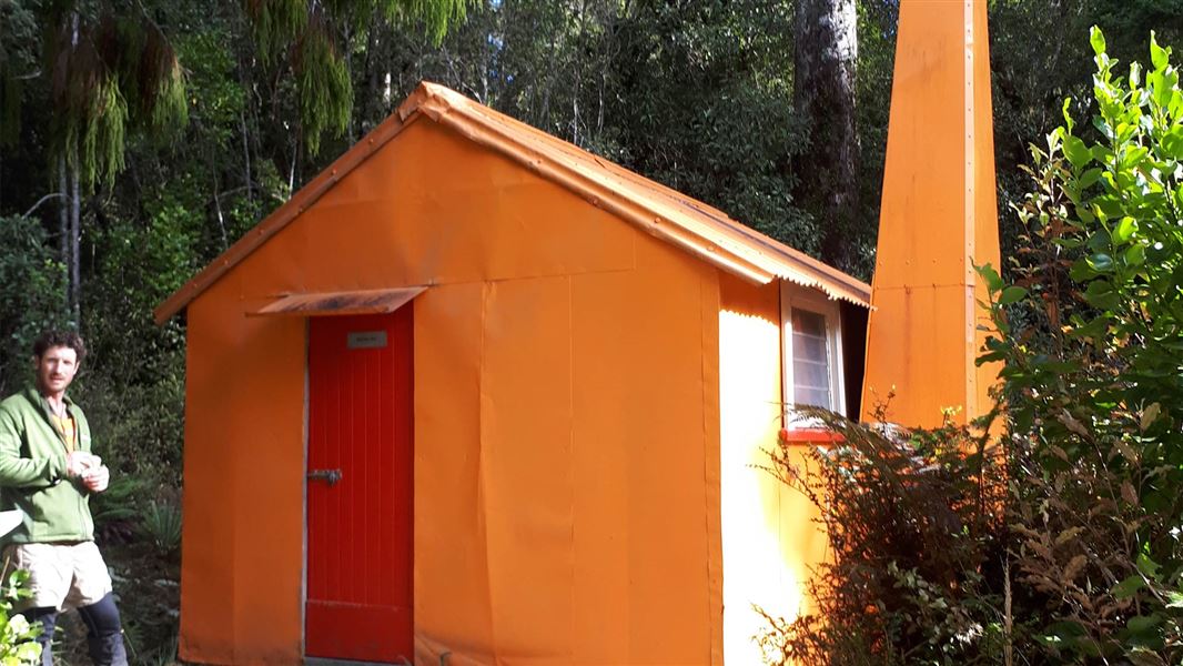 Orange tin hut in bush.