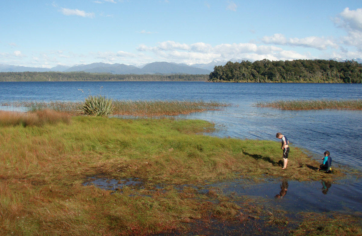 The surrounding bush is a mix of podocarps and hardwood species such as miro, matai, totara, rimu and kahikatea closer to the lake, with sub-canopy species such as kamahi, mahoe and quintinia being common. These tree species provide an important seasonal food supply for some of the birds found here; parakeets, tui, bellbird, pigeon.