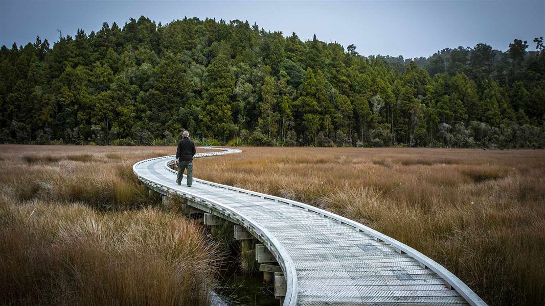From the car park by the Ōkārito School House, the track winds through bush before crossing the estuary on a curving boardwalk.