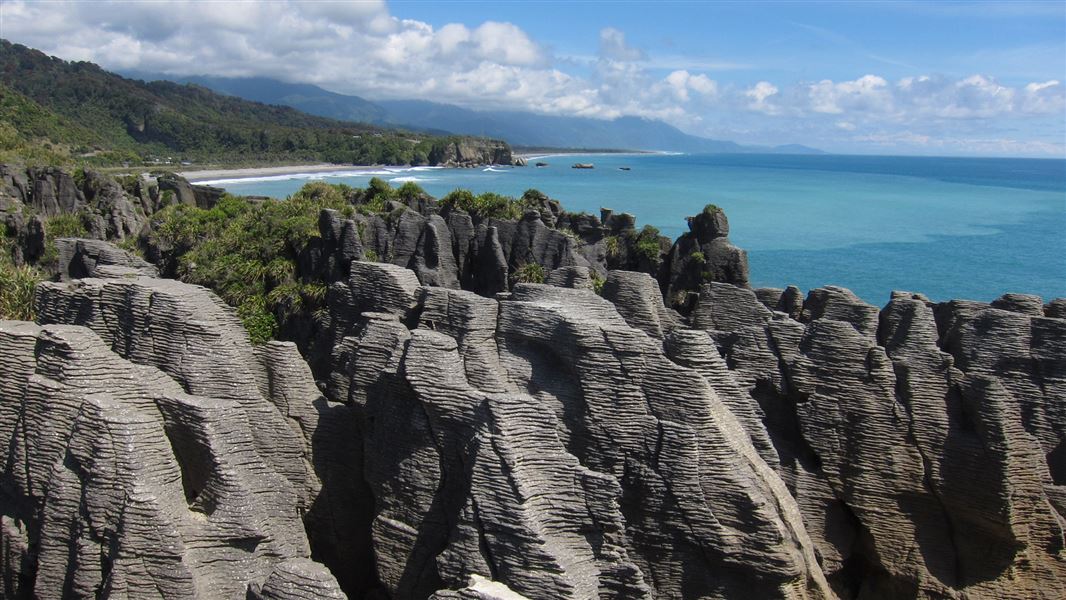 The Paparoa Range forms an impressive backdrop to the park; made of ancient granite which has been slowly shaped by ice into its present rugged outline.