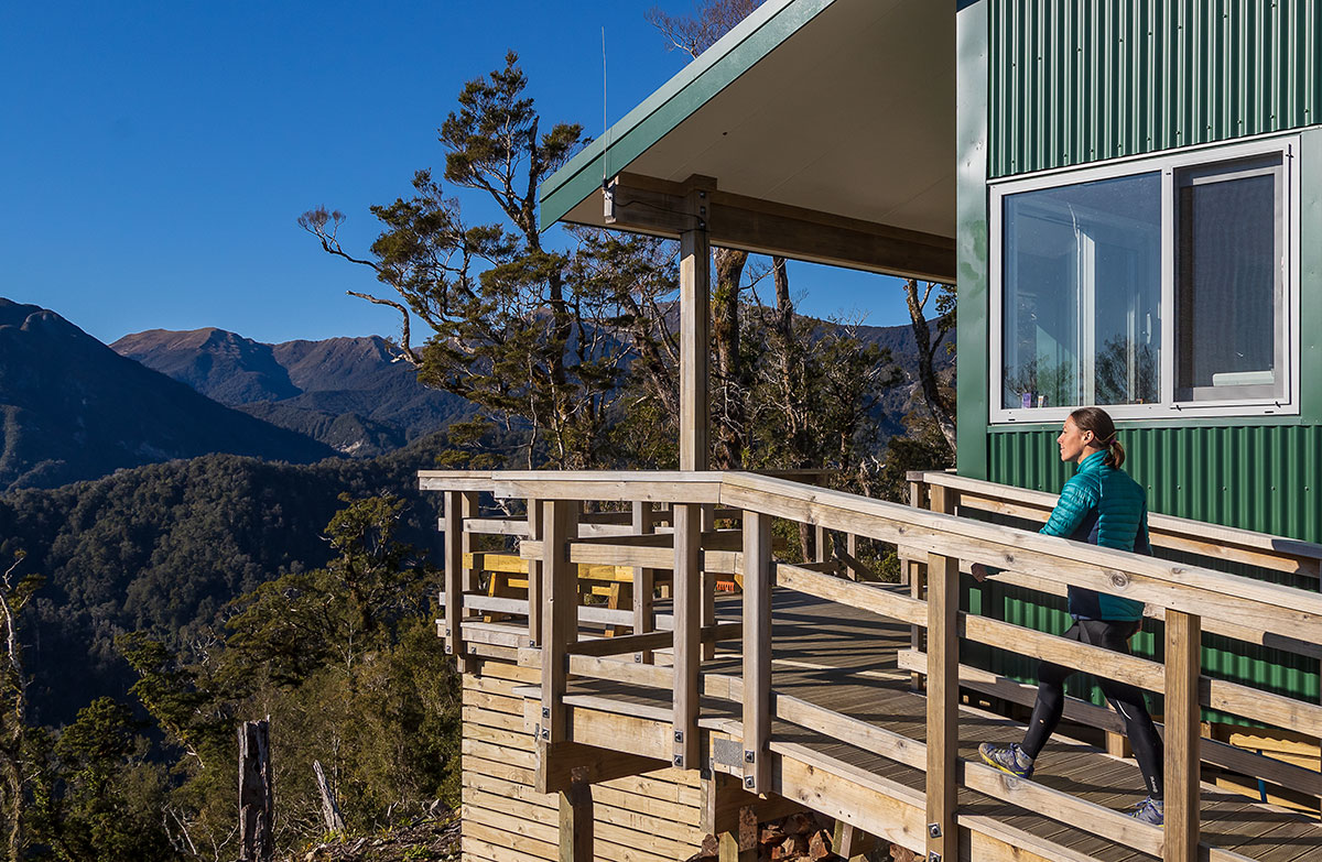 Moonlight Tops Hut has panoramic views across the Punakaiki River headwaters around to the escarpment, Pike Stream and Paparoa National Park.