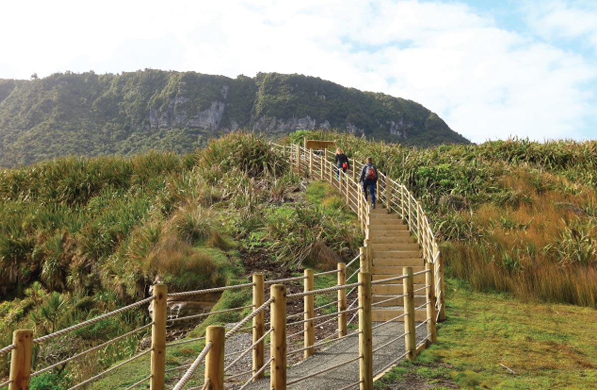The track emerges on a spectacular coastline with cliffs, caverns, a blowhole and a waterfall that plummets straight onto a rock-strewn beach. Get spectacular coastal views from a viewing platform.
