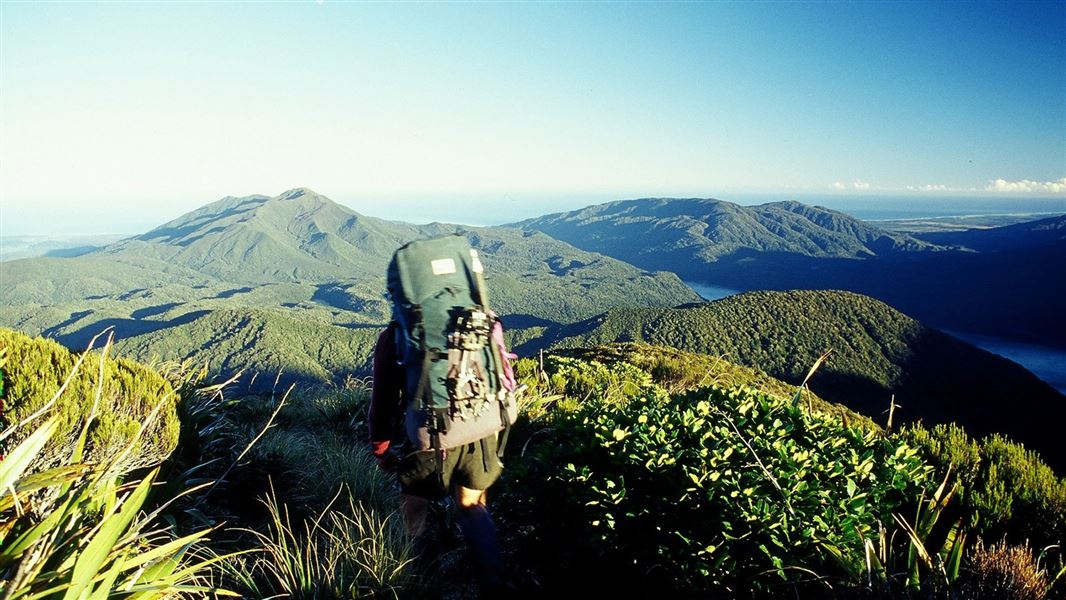It passes through tall rimu forest. There are several changes in vegetation type as your altitude increases. On a clear day, the tussock covered tops offer great views in all directions
