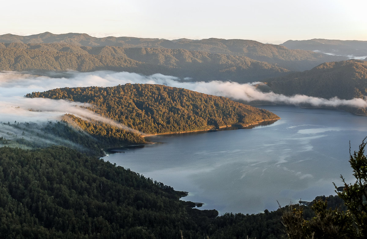 From Panekire Hut, the track heads south-west down the range to the top of the Panekire descent. From here the track drops steeply off the range into rolling valleys of beech, podocarp and kamahi forest and the lake.